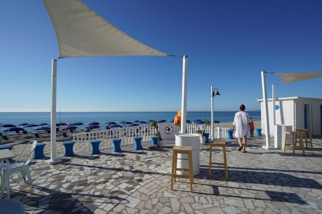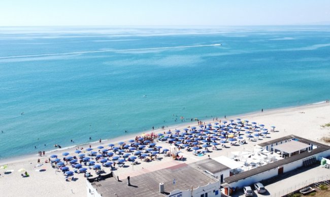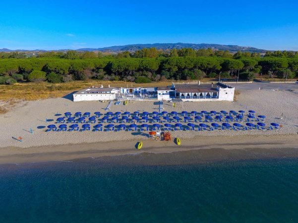 Spiaggia con lettini e ombrelloni e mare azzurro. Vegetazione e colline sullo sfondo.