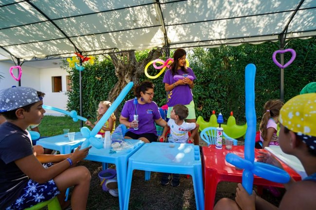 Bambini sotto un tendone giocano con educatori usando palloncini modellabili.