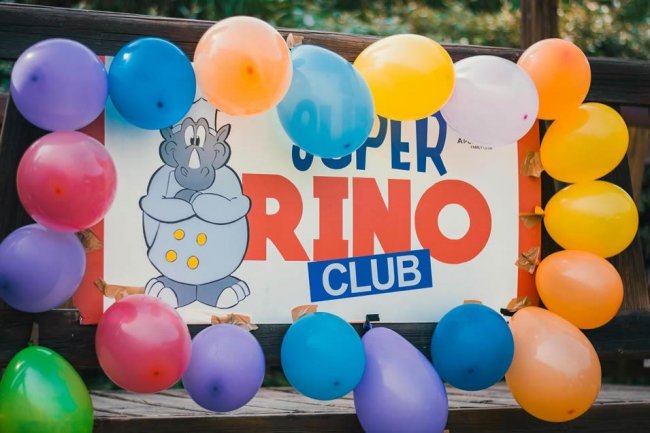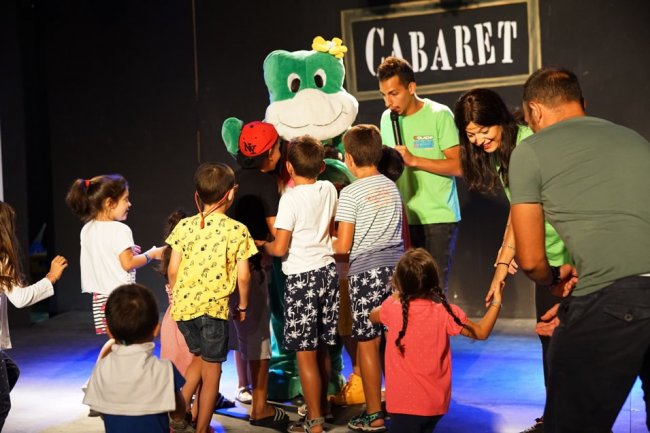 Bambini circondano una mascotte verde su un palco con la scritta