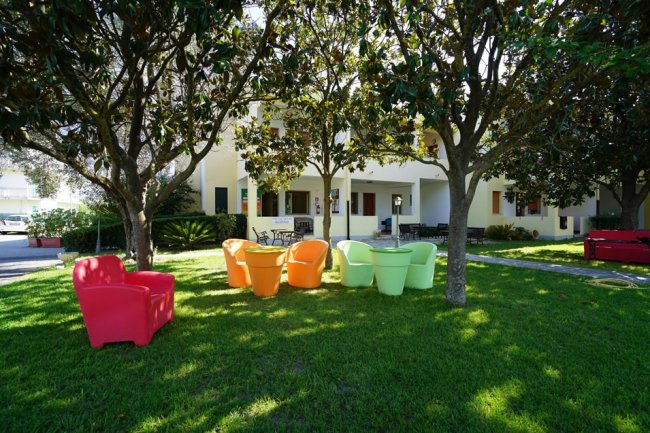 Sedie colorate sotto alberi in un giardino di una struttura residenziale.