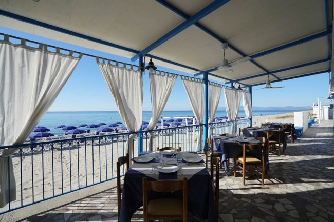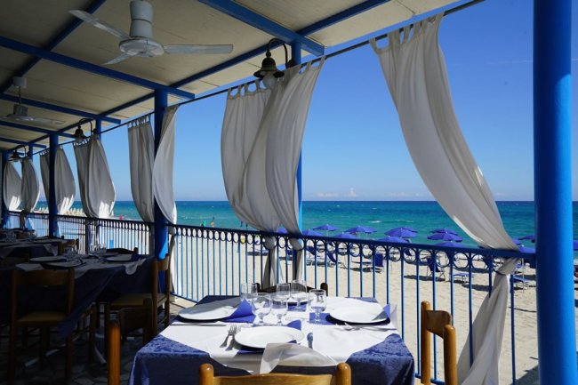 Tavoli apparecchiati con vista sul mare, tende bianche sventolano sotto una tettoia azzurra.