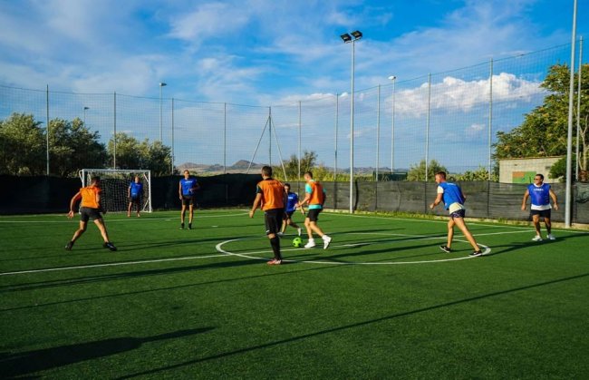 Persone giocano una partita di calcetto su un campo in erba sintetica all'aperto.