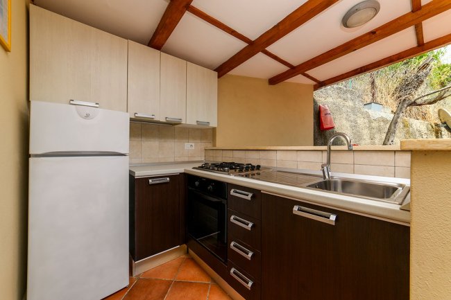 Bungalow: in muratura, monolocali e bilocali da 4 posti letto. Sono dotati di aria condizionata, bagno con doccia, bidet, phon e acqua calda, angolo cottura in patio completamente attrezzato di stoviglie e utensili da cucina.