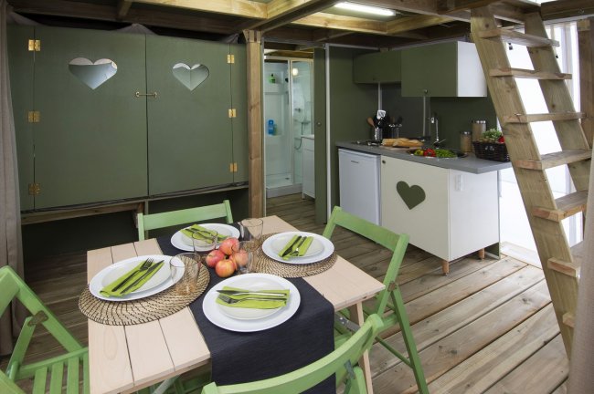 AIR LODGE TENT DOUBLE DECK TENDA SU 2 PIANI: Primo piano: 1 camera con letto matrimoniale, 1 bagno con box doccia e lavabo, soggiorno con angolo cottura attrezzato di stoviglie, Tv e aria condizionata/pompa di calore. Secondo piano: letto matrimoniale. Veranda esterna in legno arredata con tavoli e sedie, posto auto vicino all’alloggio.
