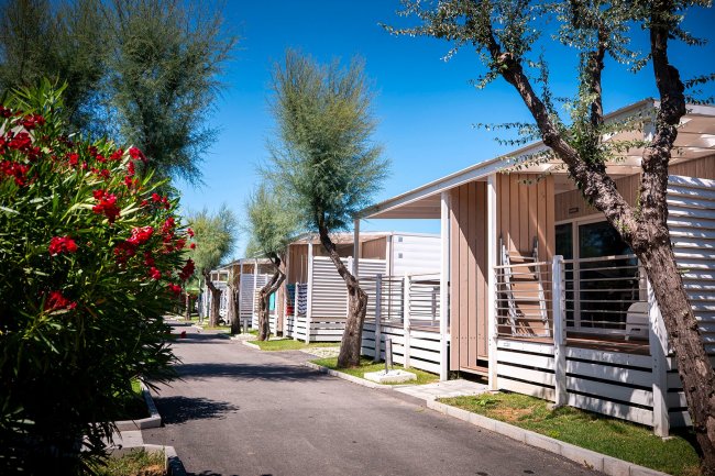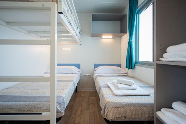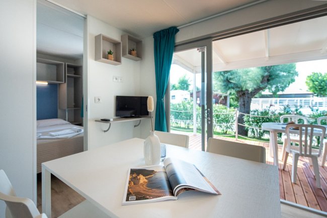 CASA MOBILE FINO A 5 PERSONE soggiorno con angolo cottura con micronde e lavastoviglie, aria condizionata, tv, camera matrimoniale con bagno con bidet e box doccia, veranda e parcheggio privato. Seconda camera con letto a castello e letto singolo con bagno privato per alloggi superiori le due persone.