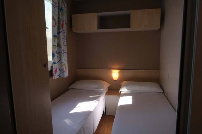 Bungalow e Case Mobile fino a 6 persone: camera con letto matrimoniale, camera con letto a castello o due letti singoli, aria condizionata, tv, bagno con doccia, cucina e veranda esterna. Presente dotazione cucina e stoviglie, ma non biancheria (lenzuola e asciugamani).