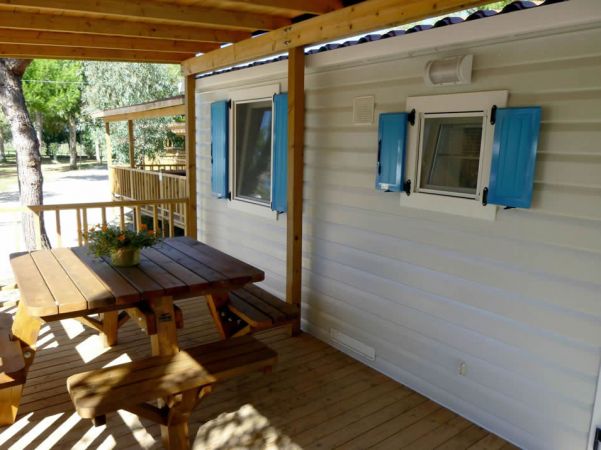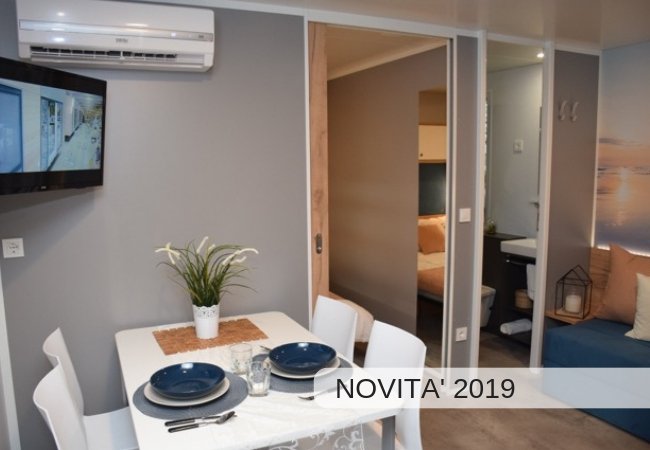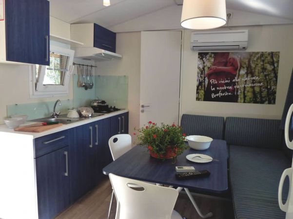 composte da una camera matrimoniale, una camera doppia con 2/3 letti singoli, bagno con doccia, lavabo, wc e bidet, soggiorno con divano e angolo cottura. In dotazione in ogni casa mobile forno a microonde, frigorifero, tv Lcd con braccio orientabile e aria condizionata. All’esterno veranda coperta arredata di tavolo e panche. Per gli ospiti delle casemobili una zona riservata in piscina con 2 lettini e 1 ombrellone per ogni mobile home compresi nel prezzo