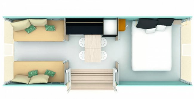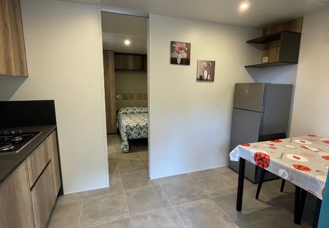 VILLINI FINO A 4 POSTI: moderni villini/case mobili di nuova generazione, da 23 a 32 mq con veranda esterna. dotati di aria condizionata (caldo/freddo), soggiorno con cucina open space, camera da letto matrimoniale e bagno con doccia e bidet. Seconda camera con due letti singoli nei villini 4 posti