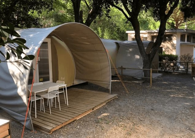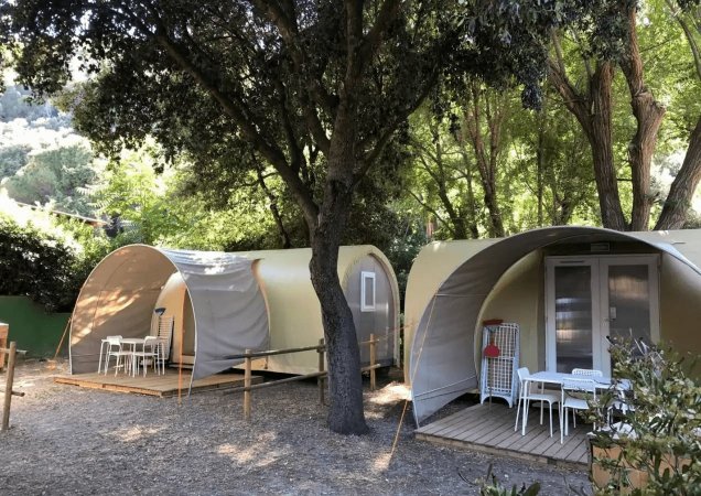 GLAMPING COCO TENDA: Tende attrezzate composte da ingresso con frigo e microonde, piccolo tavolo con sgabelli, mobile porta oggetti. Attrezzata con piano cottura e stoviglie.U na camera matrimoniale e una camera con 2 letti singoli.Veranda con tavolo e sedie. No bagno