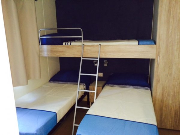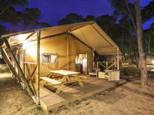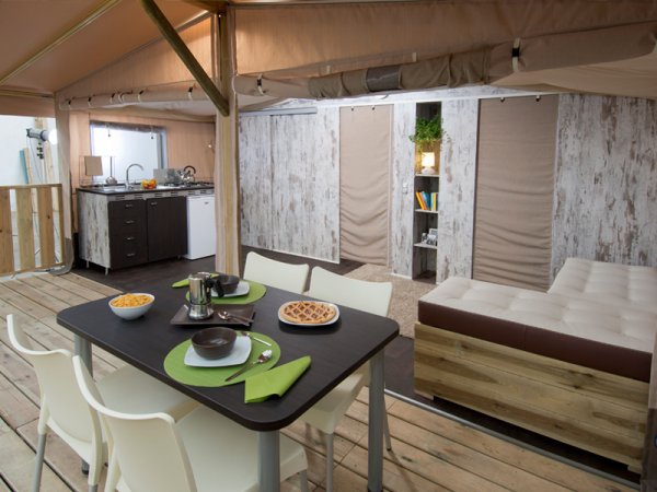 TENDA SAFARI 5 posti, tenda trilocale con camera matrimoniale, cameretta con letto a castello e letto singolo, bagno con doccia, wc e lavabo.