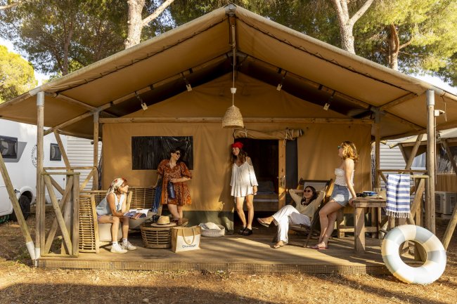 FAMILY E LUXURY GLAMPING TENT Glamour ed esotica, per sentirsi come in un safari. Tenda Glamping che può ospitare 2 o 5 persone. Bagno privato. Biancheria da letto e a bagno non inclusa. Patio arredato con tavolo e sedie no angolo cottura.